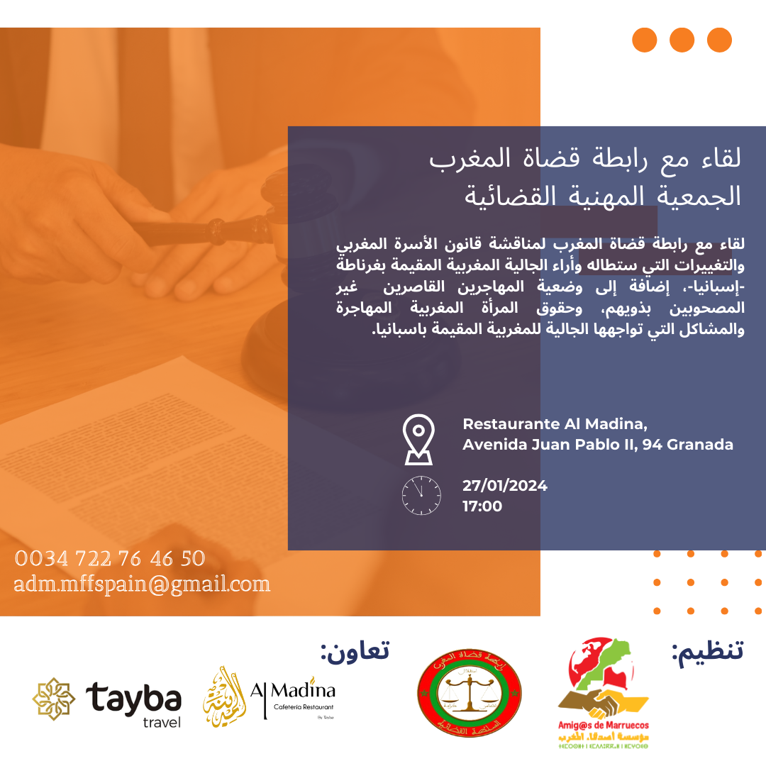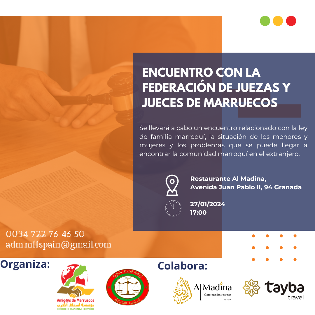 El 27 de enero de 2024 se celebró en el Restaurante Al Madina (Granada) un encuentro con la Federación de Juezas y Jueces de Marruecos, centrado en la ley de familia marroquí (Moudawana) y en los retos legales que afectan a menores, mujeres y a la comunidad marroquí residente en el extranjero. Durante