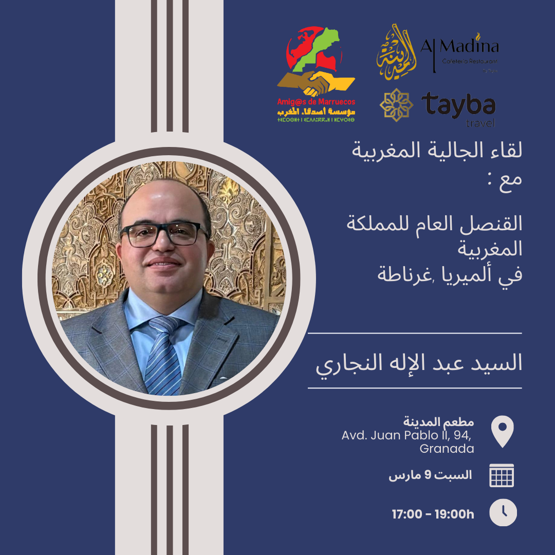 El 9 de marzo de 2024, la Asociación Amigos de Marruecos, en colaboración con el Restaurante Al Madina (Avda. Juan Pablo II, 94, Granada), organizó el primer encuentro del Cónsul del Reino de Marruecos en Almería y Granada, D. Abdelilah Nejjari, con la comunidad marroquí residente en Granada.