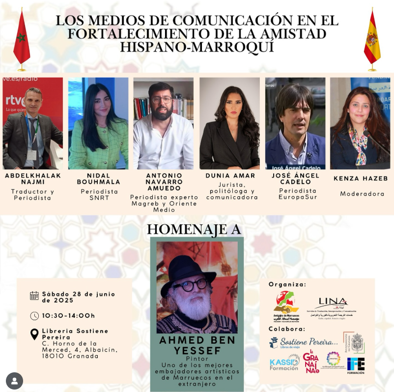 El 28 de junio de 2025, la Asociación Amigos de Marruecos, en colaboración con SL Lina, celebró en la Librería Sostiene Pereira (C. Horno de la Merced, 4, Albaicín, Granada) la I Jornada “Los Medios de Comunicación en el Fortalecimiento de la Amistad Hispano-Marruequí”, un encuentro que reunió a periodistas, comunicadores y especialistas de España y Marruecos para reflexionar sobre el papel de la prensa en la construcción de puentes entre ambas culturas.